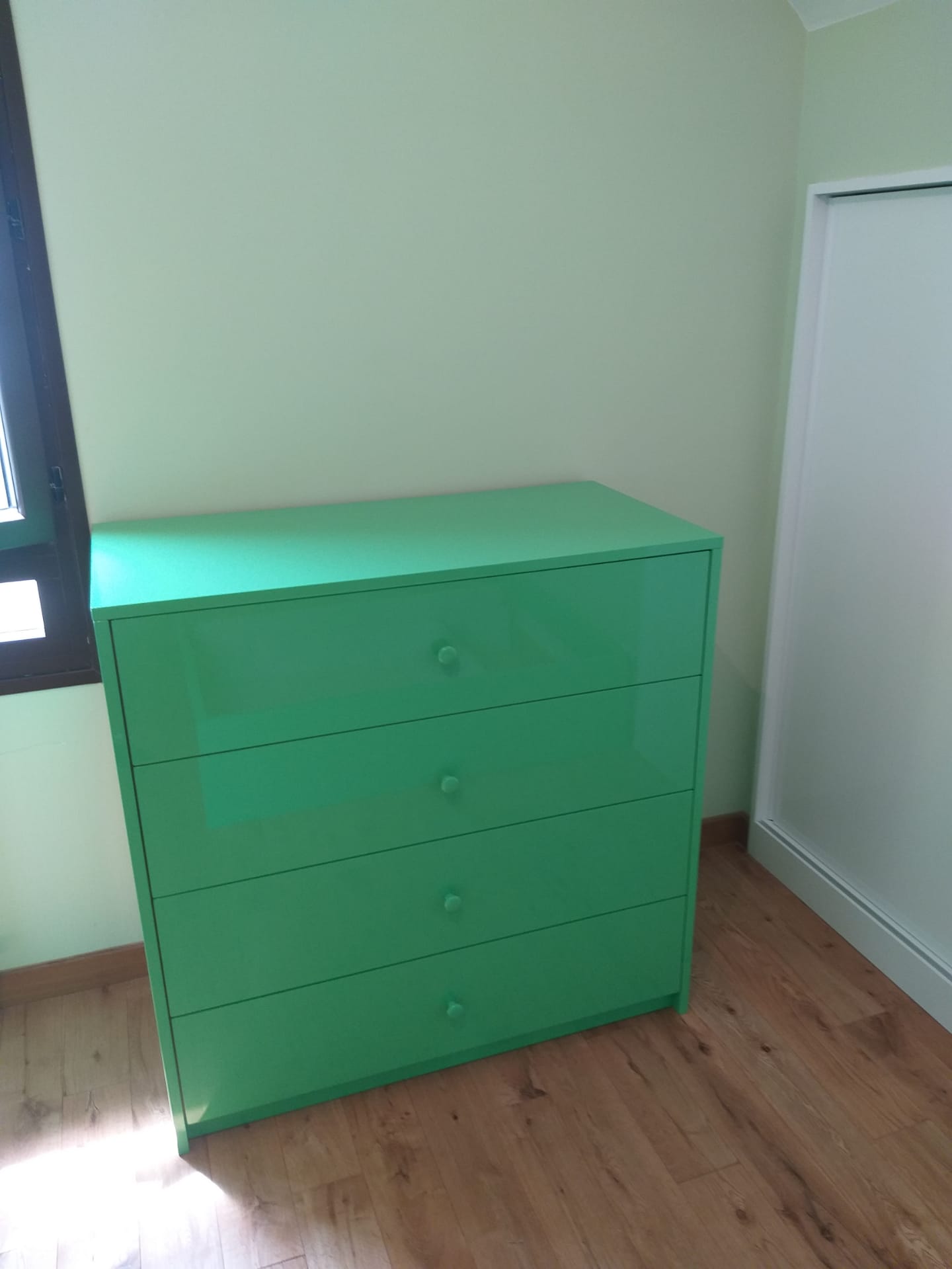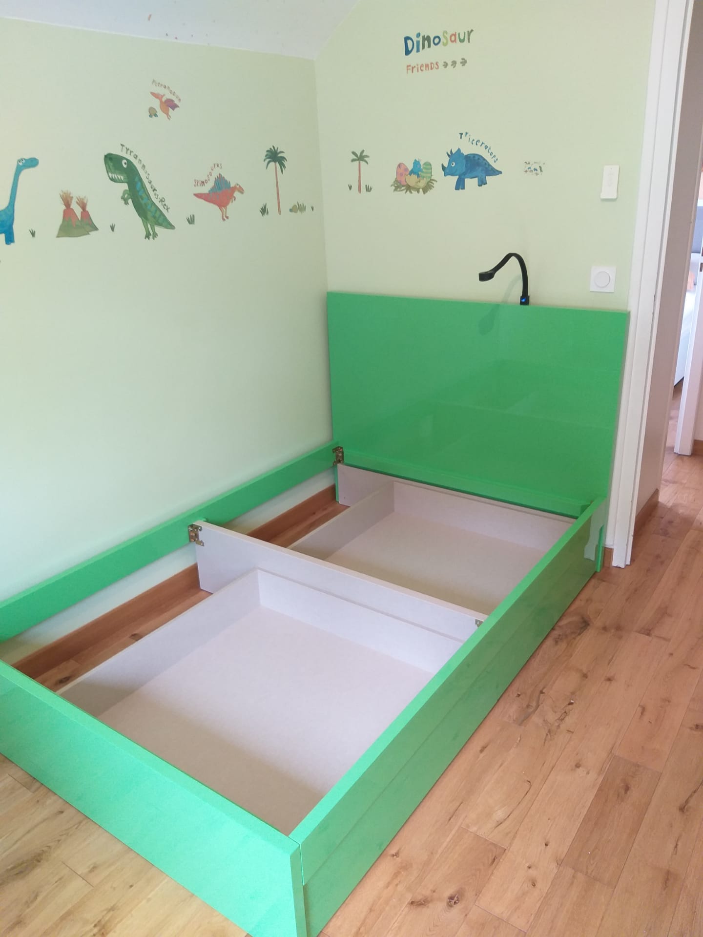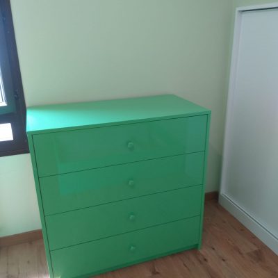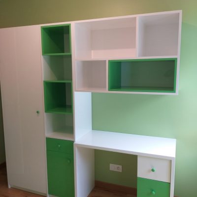 De plus, l’ensemble est en médium laqué vert et blanc. Le placard avec une porte coulissante est en médium laqué blanc et l’intérieur en mélamine lino Cancun.
