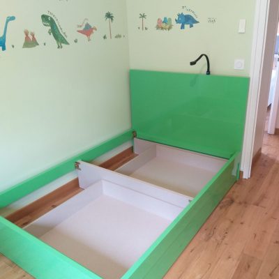 L’équipe de Il était une cuisine à installé une chambre d’enfant verte et blanche. Elle comprend un bureau, une bibliothèque, un placard, une commode et un lit assorti !