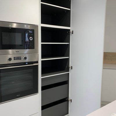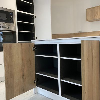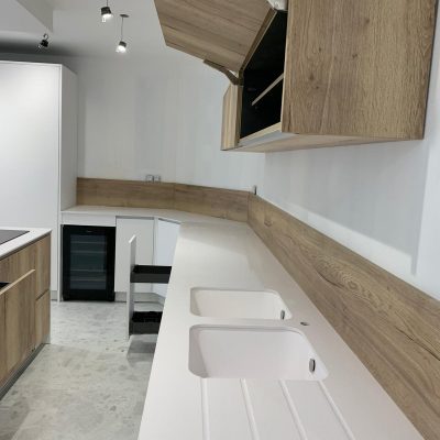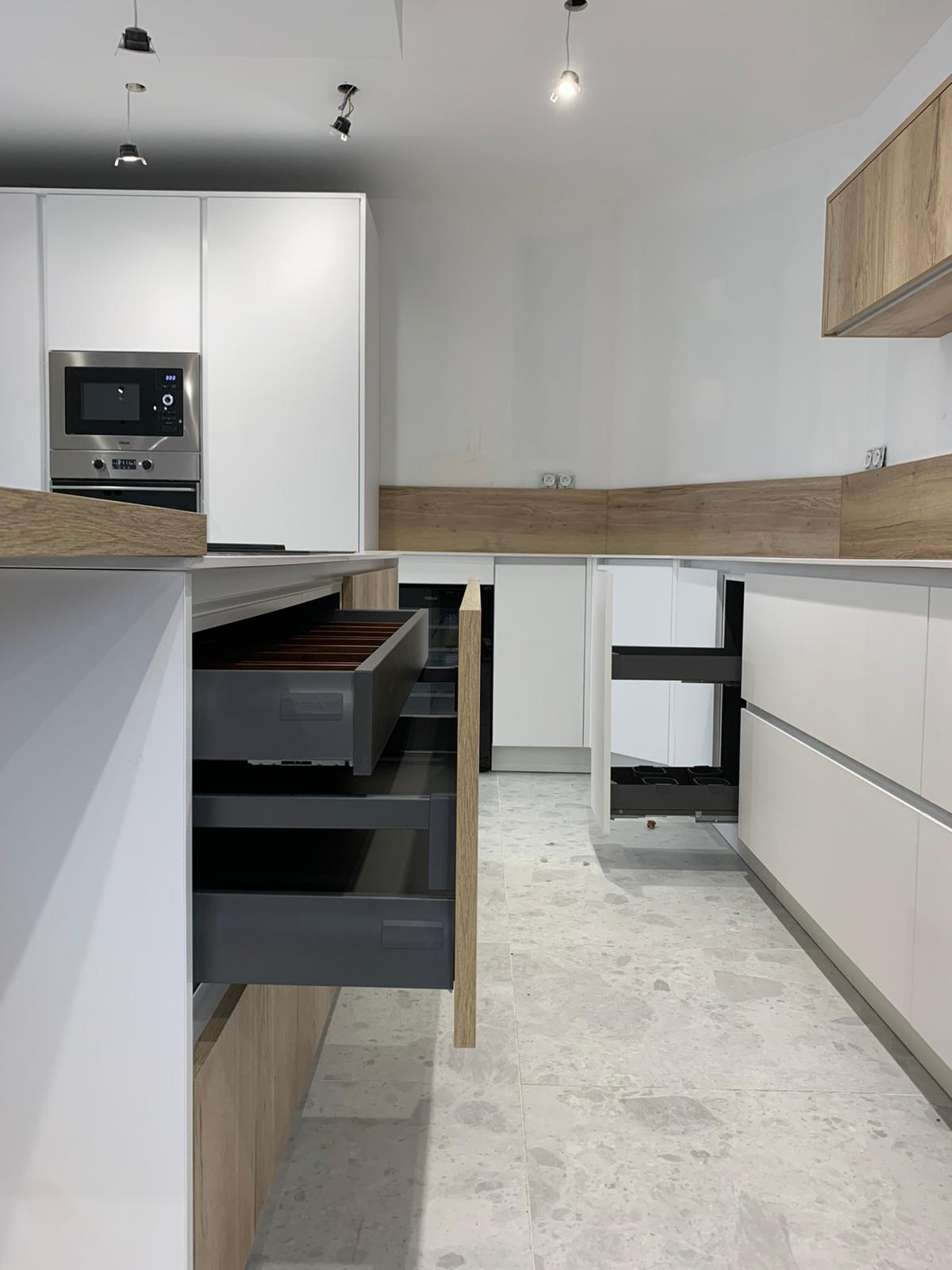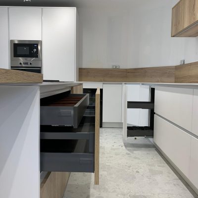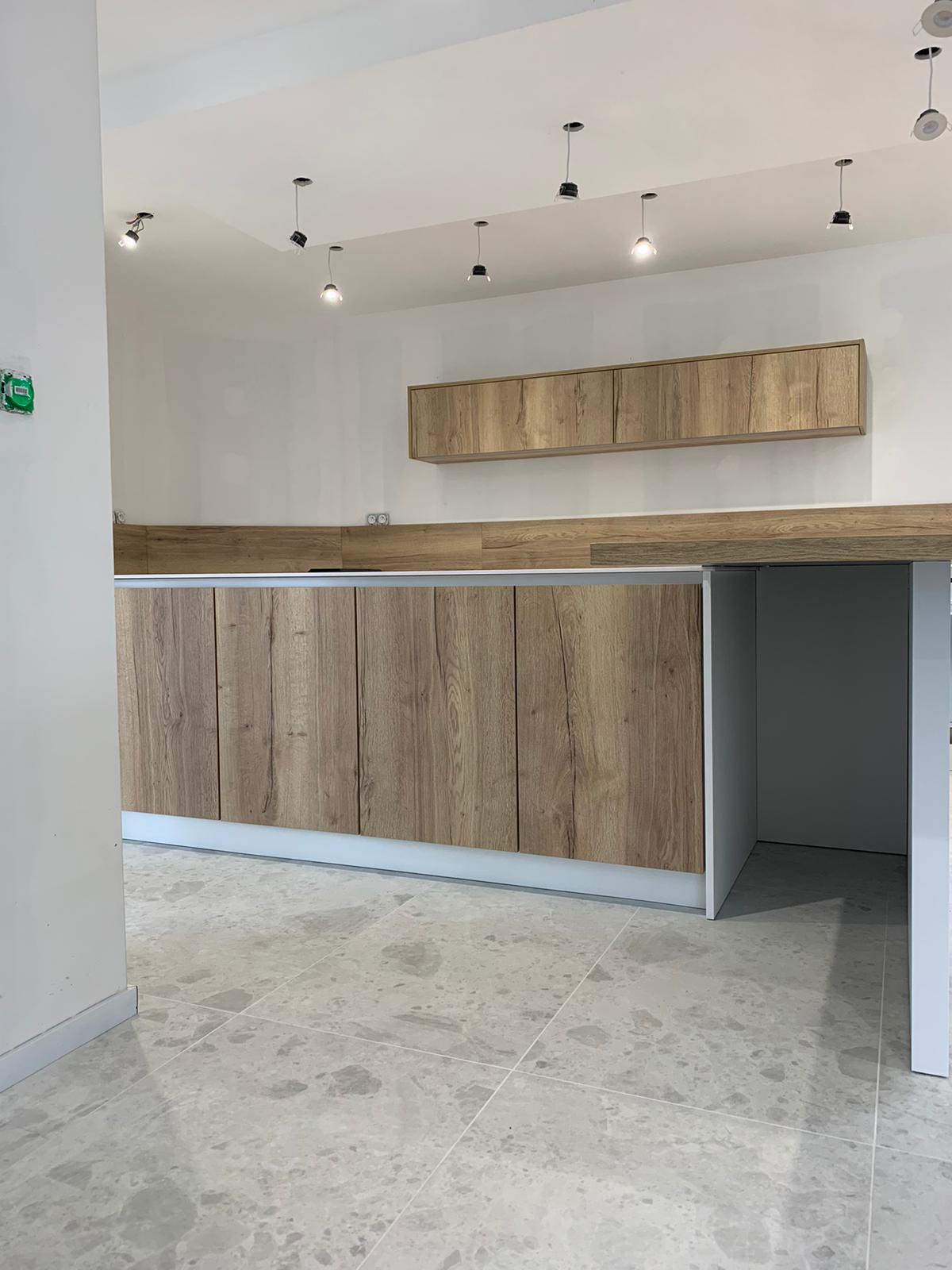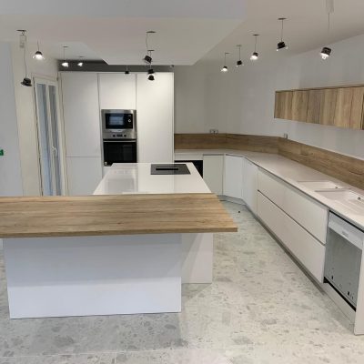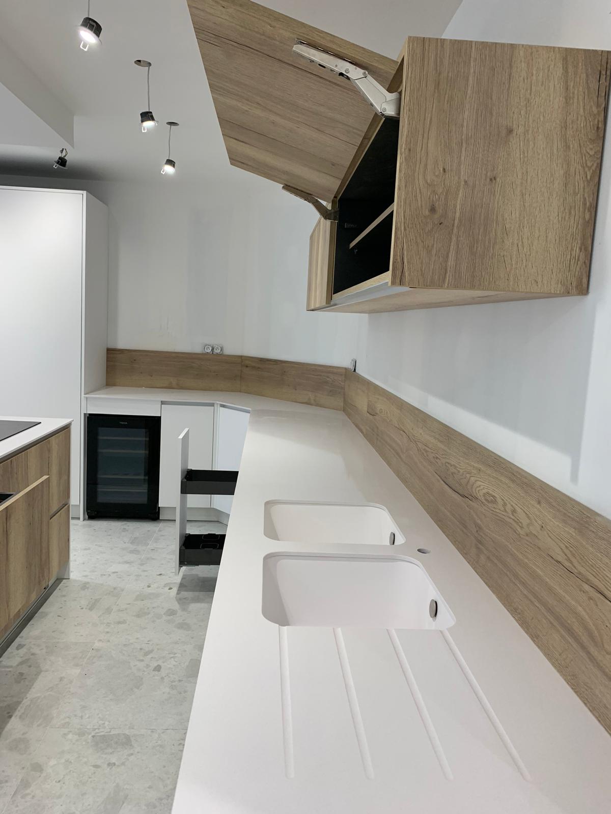 Tout d’abord, nous disposons d’une large gamme de couleurs, motifs et textures qui permet de réaliser toutes vos envies, comme cette cuisine blanc et bois. Tous les meubles sont fabriqués avec des matériaux de haute qualité pour assurer le confort et la longévité du produit.