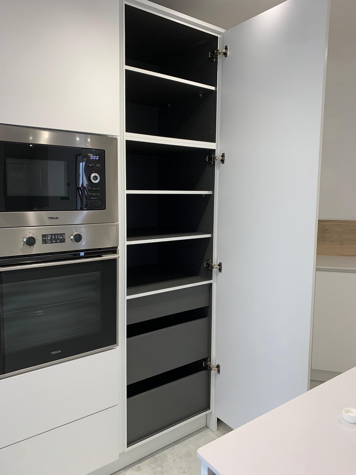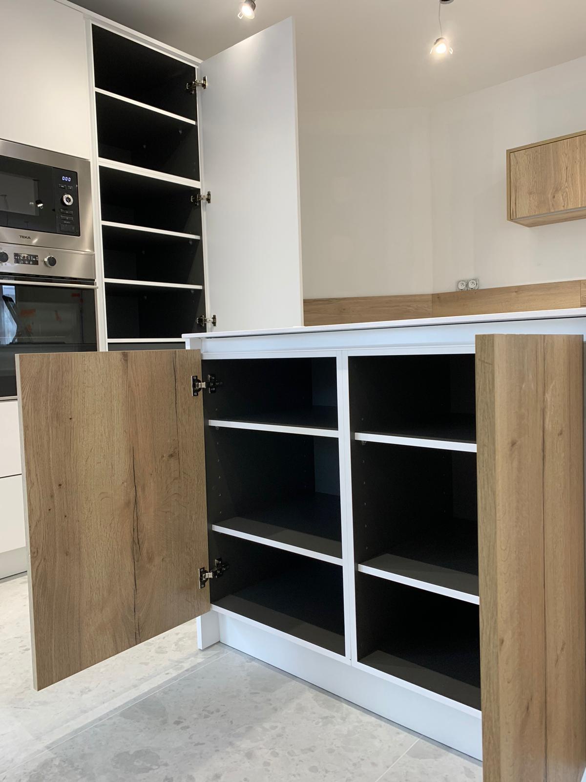 -Les façades blanches sont en décor Blanc premium, sa nuance chaude crée des contrastes harmonieux avec les bois naturels.