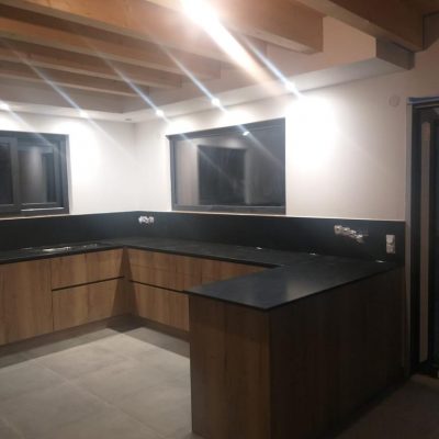 Le plan de travail est en granit Zimbabwe cuir. Pour plus d’informations sur ce matériau, cliquez : https://www.iletaitunecuisine.com/2021/10/08/le-granit-noir-zimbabwe-cuir/