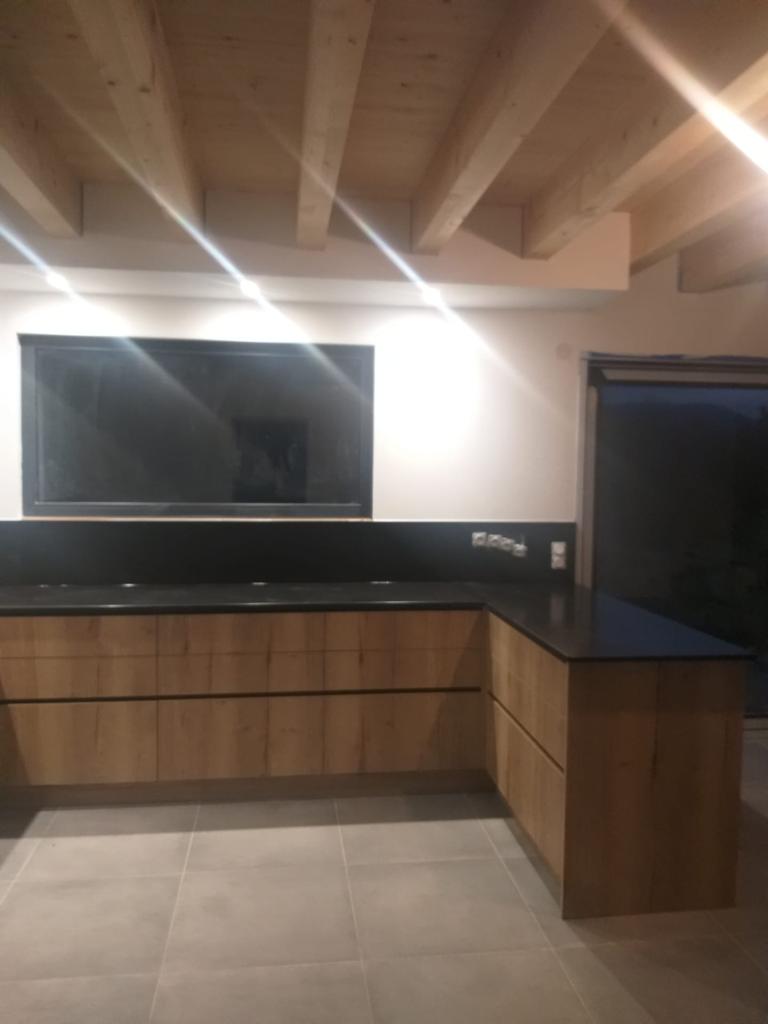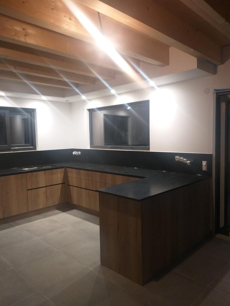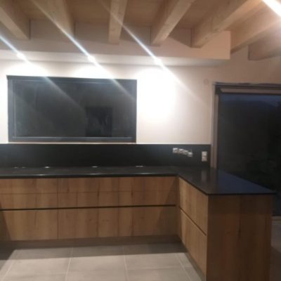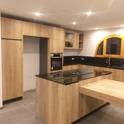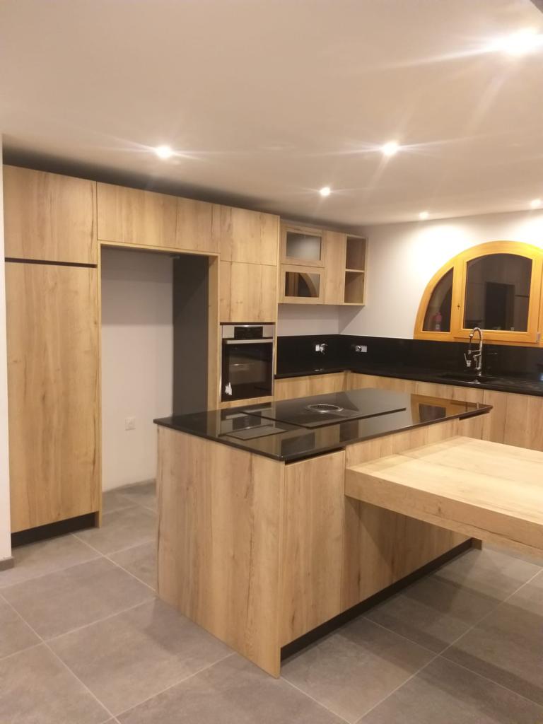 Tout d’abord, nous disposons d’une large gamme de couleurs, motifs et textures qui permet de réaliser toutes vos envies, comme cette cuisine bois et noir. Tous les meubles sont fabriqués avec des matériaux de haute qualité pour assurer le confort et la longévité du produit.