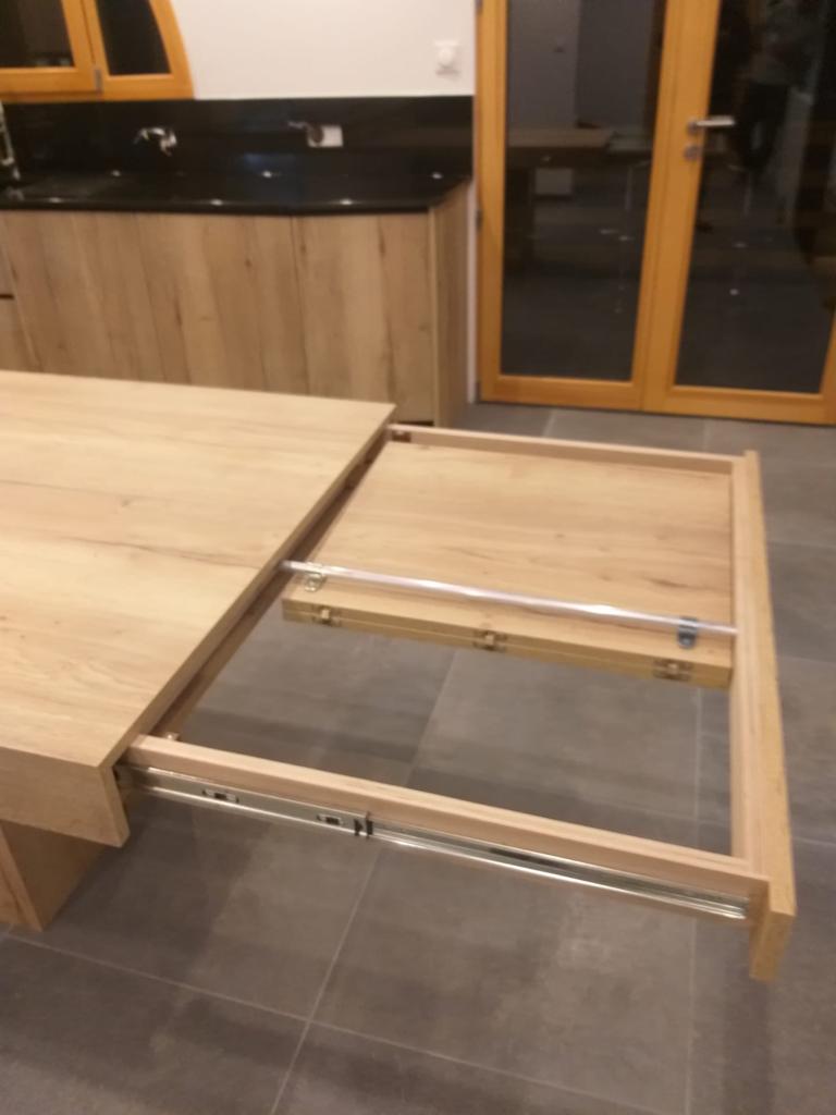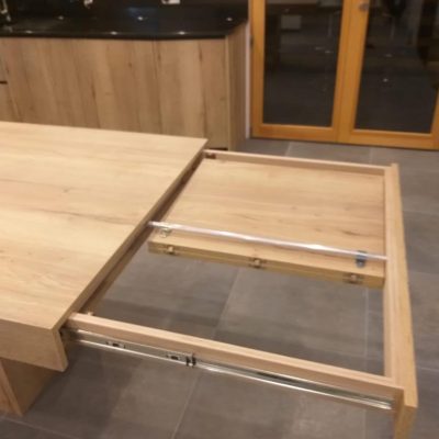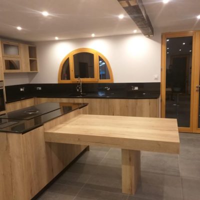 Il était une cuisine a installé une cuisine bois et noir : les surfaces et la table sont en stratifié Chêne Halifax.
