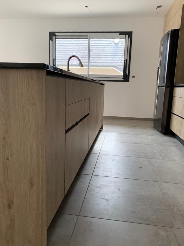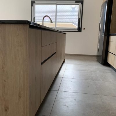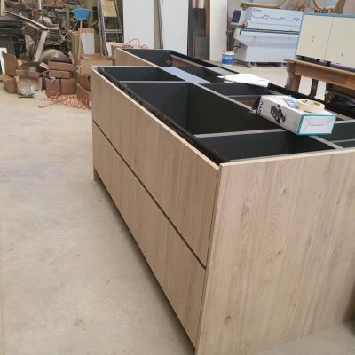 Plan de travail : pierre naturel granit noir Zimbabwe finition poli avec effet cuir de 20 mm d’épaisseur