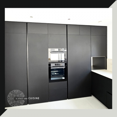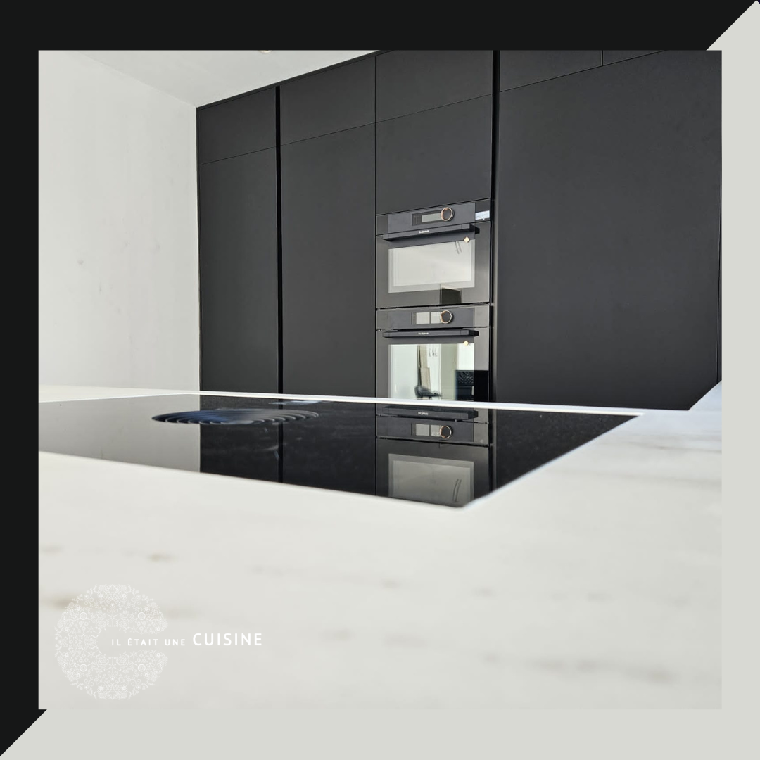 Cette cuisine moderne présente des armoires et des surfaces noires, créant une ambiance sophistiquée et mystérieuse. Les armoires noires, d’une finition lisse et élégante, apportent une touche de raffinement à l’espace. Le plan de travail blanc, brillant et luxueux, contraste magnifiquement avec les armoires sombres, créant une esthétique équilibrée et élégante.