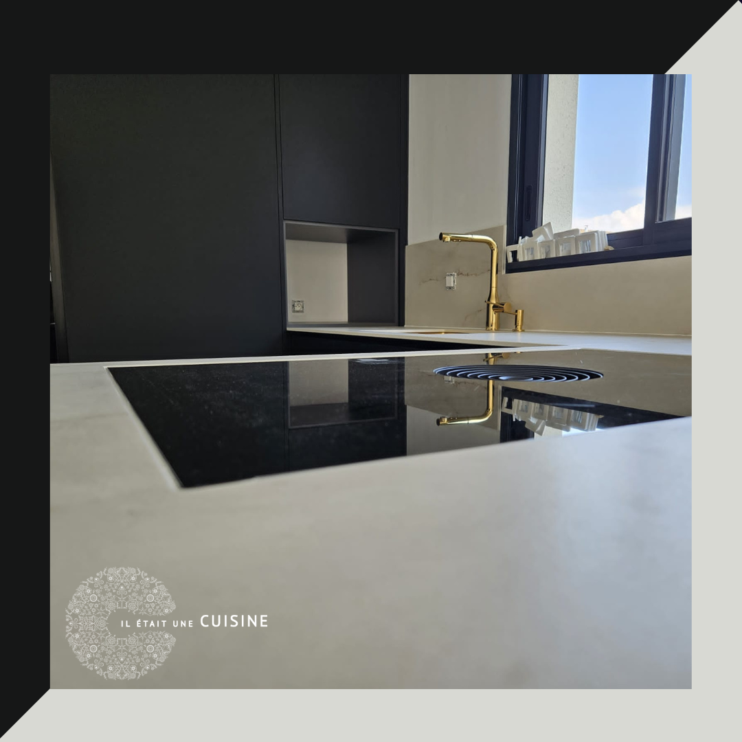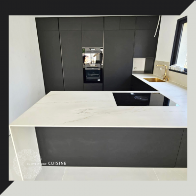 Dans l’ensemble, cette cuisine allie harmonieusement le contraste entre le noir profond, le blanc éclatant et les accents dorés, créant un espace moderne, élégant et plein de caractère.