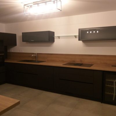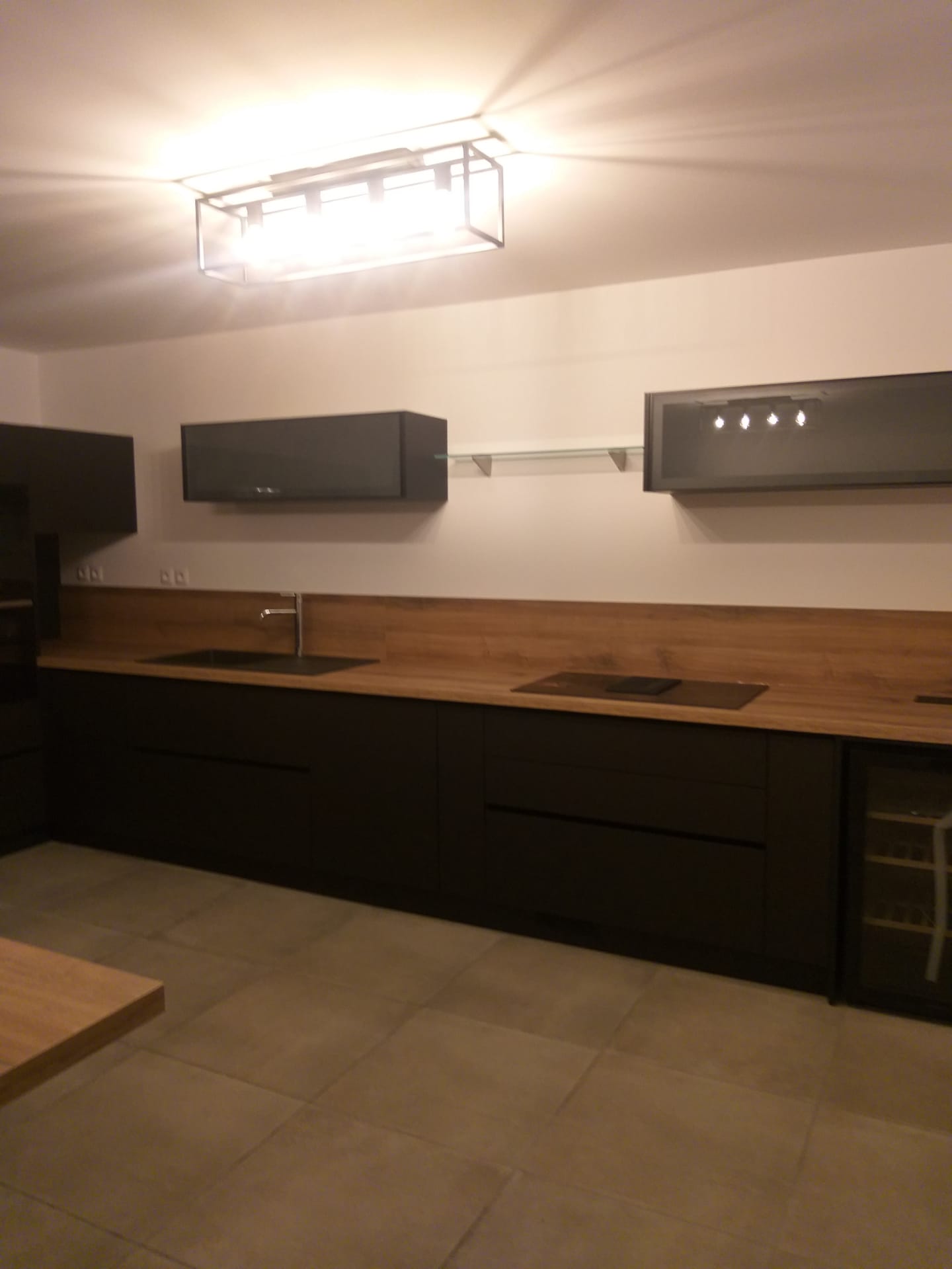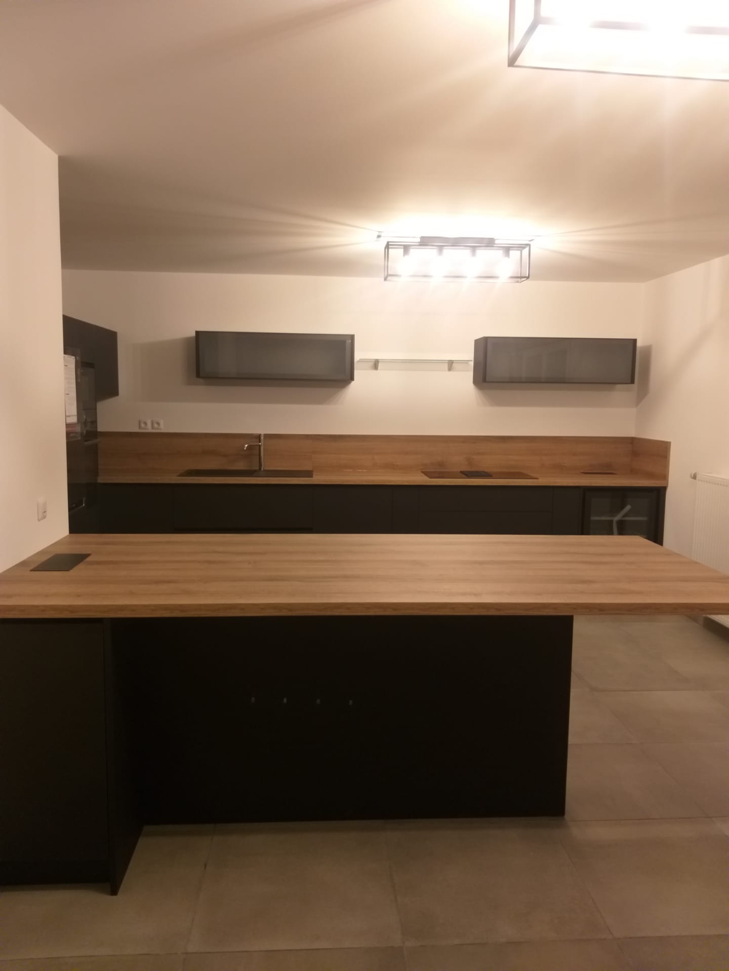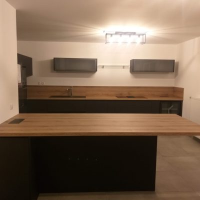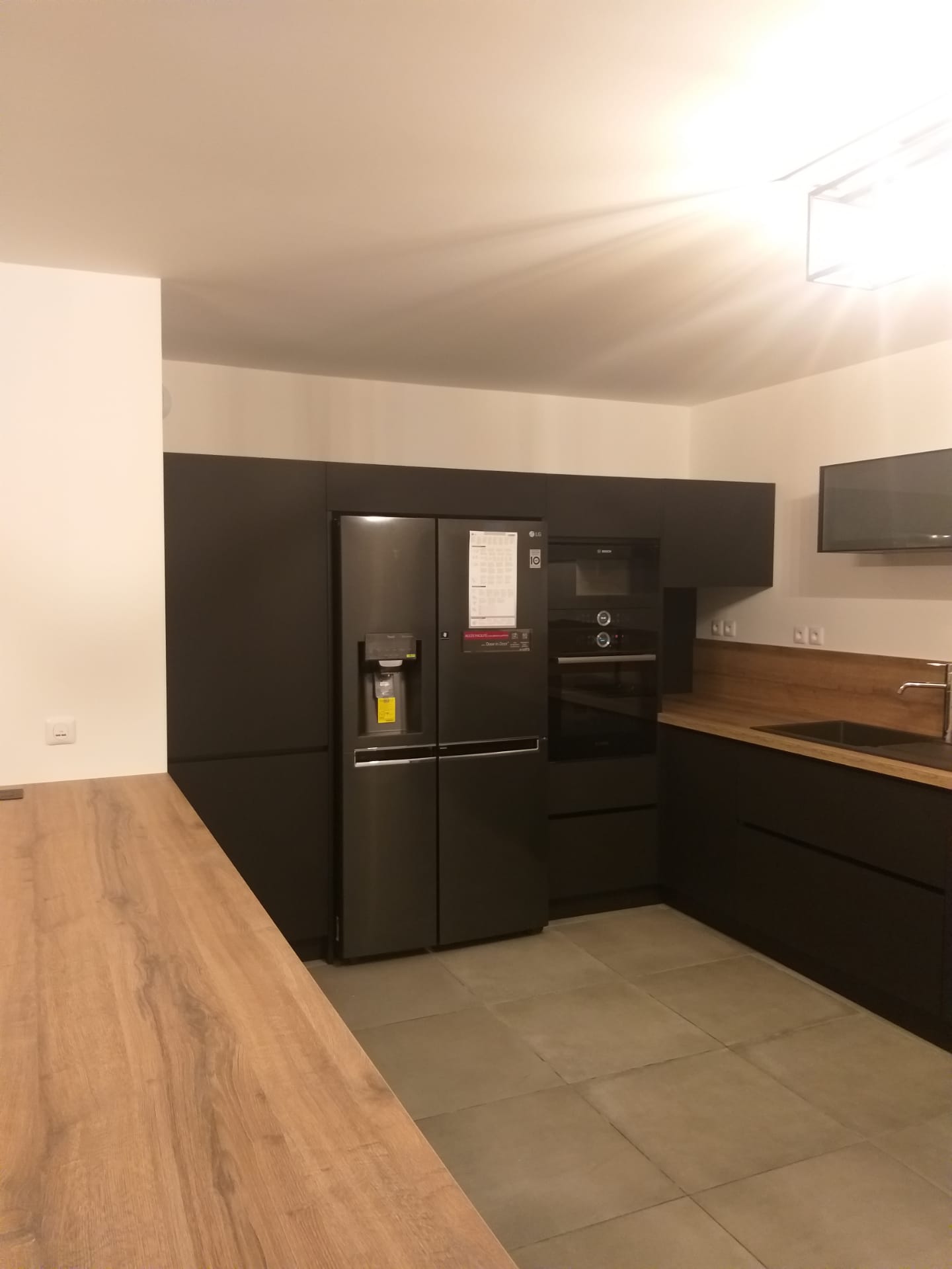 Il était une cuisine a installé une cuisine noir et bois. Les façades sont en médium laqué extra mat et le plan de travail en stratifié chêne Halifax tabac. L’évier est sous le plan de travail, pour l’esthétique, mais également pour faciliter l’entretien du plan de travail.