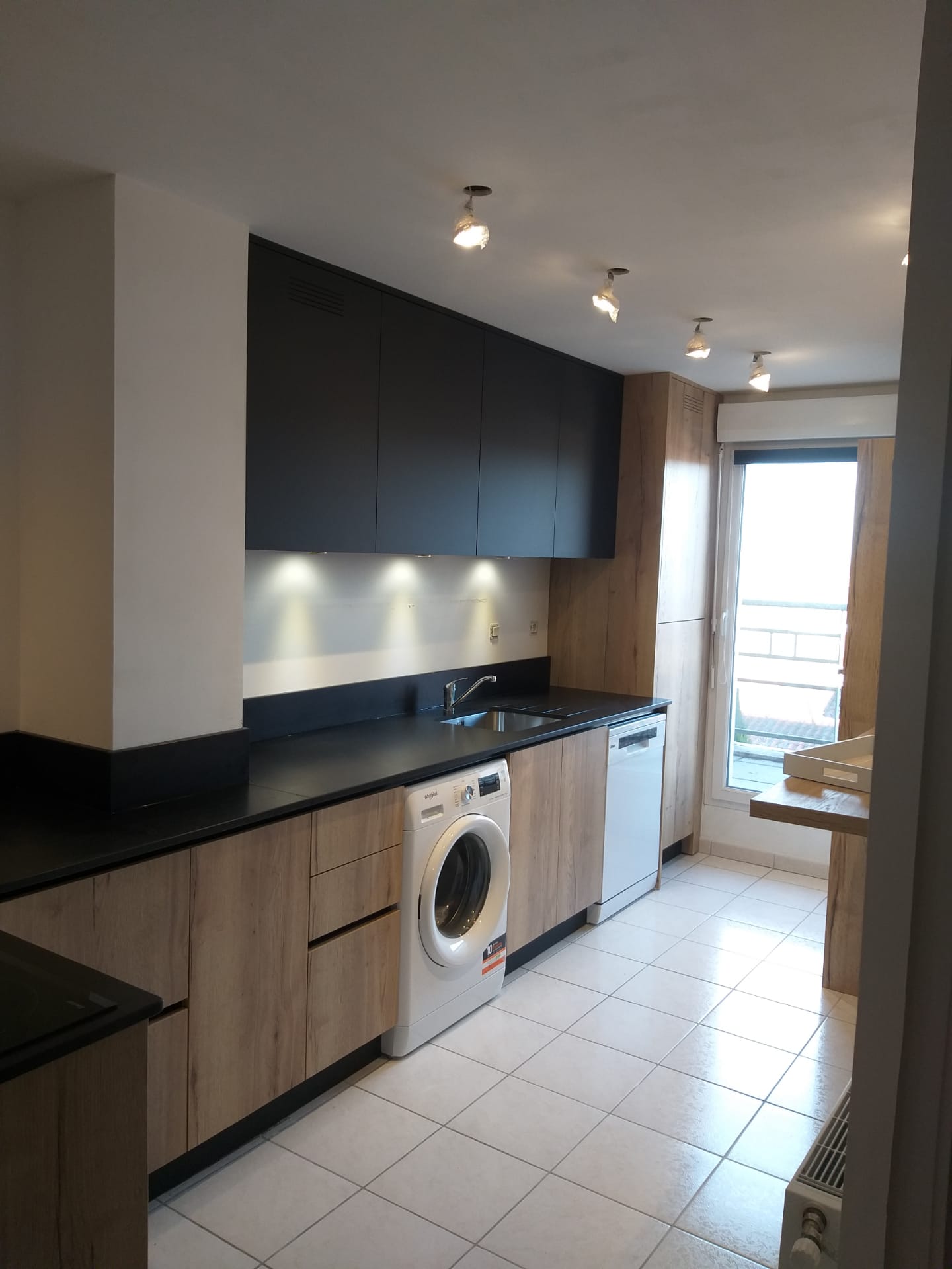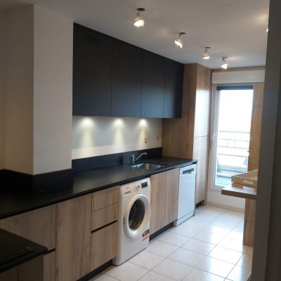 Tout d’abord, nous disposons d’une large gamme de couleurs, motifs et textures qui permet de réaliser toutes vos envies comme cette cuisine -noir et bois Les matériaux de haute qualité pour assurer le confort et la longévité du produit.